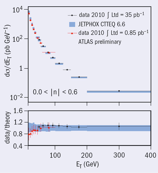 The analysis uses the full 2010 data sample collected by ATLAS in LHC proton–proton collisions at 7 TeV, corresponding to an integrated luminosity of 35 pb–1. The result extends the measurement of the cross-section up to a photon transverse momentum of 400 GeV (figure 1), thus covering a kinematic region similar to that achieved at Femilab’s Tevatron and by the CMS collaboration at the LHC. QCD calculations performed at next-to-leading order (NLO) predict cross-sections that are in good agreement with the measured data across five orders of magnitude. Below 25 GeV, where the NLO predictions are less accurate, the predicted cross-section is larger than that measured in the data.