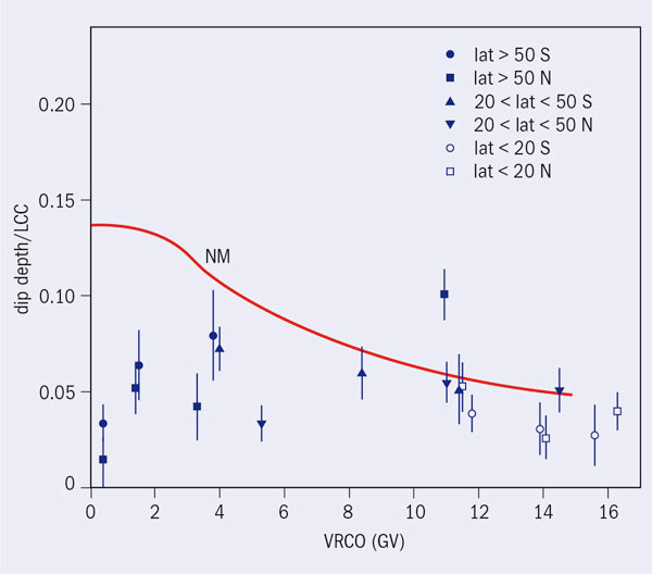 A test of the causal hypothesis is to examine the correlation as a function of geomagnetic latitude. The 11-year cosmic-ray variation becomes bigger at higher magnetic latitudes because of the effect of the Earth’s magnetic field. Fewer low-energy cosmic rays enter the Earth’s atmosphere near the magnetic equator than near the poles. This effect is measured by the vertical rigidity cut-off (VRCO) – the minimum rigidity for a primary cosmic ray to reach the Earth’s atmosphere – which is computed from the local value of the planet’s magnetic field. Our analysis looked at the differences between the low cloud cover at solar minima in 1985 and 1996 and that at solar maximum in 1990 at different VRCO (Sloan and Wolfendale 2008). These were then compared with the changes in the cosmic-ray rate as measured from neutron monitors located around the world (figure 2). If the dip in the low cloud cover observed in 1990 was caused by the decrease in ionization from cosmic rays then all of the points in figure 2 would follow the line of the cosmic-ray variation, marked NM. They do not.