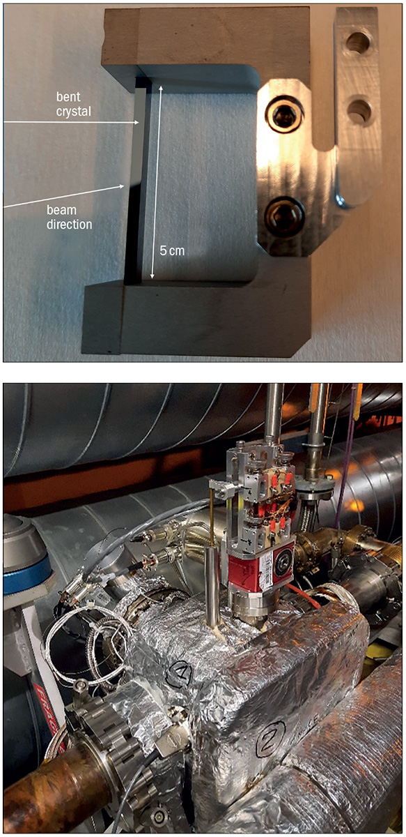 At the LHC, a total of four bent crystals are needed for the horizontal and vertical collimation of both beams. During Run 2, a test stand for crystal-collimation tests was installed in the LHC betatron cleaning region of IR7 with the aim of demonstrating the feasibility of this advanced collimation technique at LHC energies. Silicon crystals with a length of just 4 mm were bent to a curvature radius of 80 m to produce a 50 μrad deflection – much larger than the few-μrad angles typically experienced by proton interaction with the 60 cm-long primary collimators (see “Silicon swerve” image). Indeed, to produce such a kick with conventional dipole magnets would require a field of around 300 T in the same volume of the crystal. The crystals were mounted on an assembly (see “On target” image) that is a jewel of accelerator technology and control: the target collimator primary crystal (TCPC). This device allows the crystal to be moved to the desired distance from the circulating beam – typically just a few millimetres at 7 TeV – and its angular orientation to be adjusted to better than 1 μrad. While the former is no more demanding than the control system of other LHC collimators, the angular control demands a customised technology that is the heart of LHC crystal collimation.