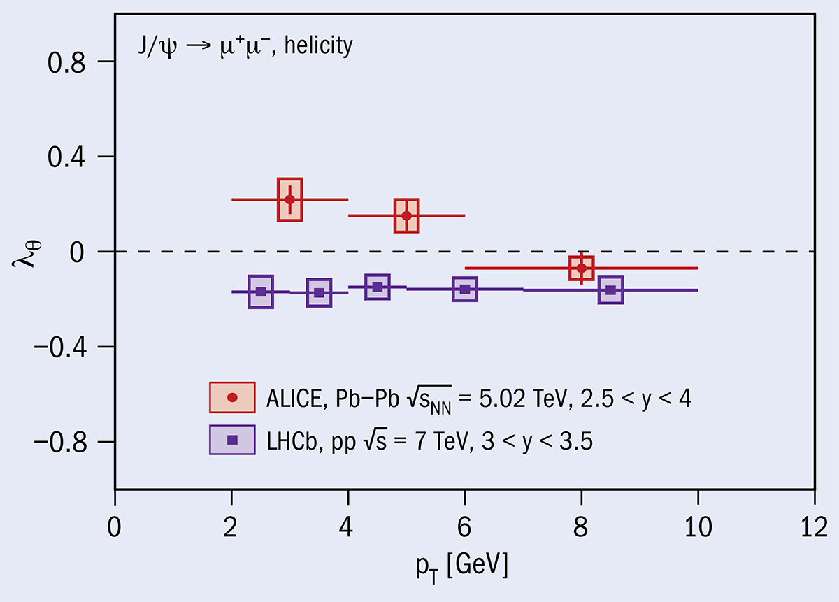 ALICE measures quarkonia spin orientations with respect to a chosen axis via a measurement of the anisotropy in the angular distribution of the decay products. The angular distribution is parametrised in terms of the polarisation parameters, λθ, λφ and λθφ, where θ and φ are the polar and azimuthal emission angles. If all of them are null, no polarisation is present, whereas (λθ = 1, λφ = 0, λθφ = 0) and (λθ = –1, λφ = 0, λθφ = 0) indicate a polarisation of the spin in the transverse and longitudinal directions, respectively.