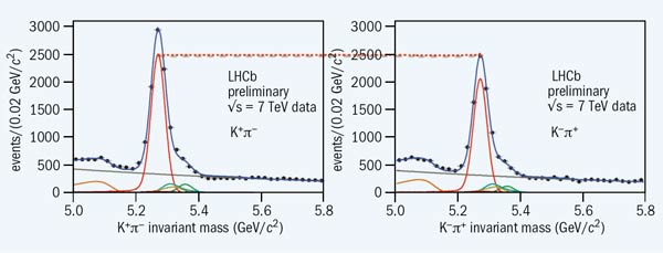 The CP asymmetry for the B0→Kπ decay is defined as ACP(B0→Kπ) = [Γ(B0→K–π+) – Γ(B0→K+π–)] / [Γ(B0→K–π+) + Γ(B0→K+π–)]. As figure 1 shows, the asymmetry is clearly visible in the raw invariant mass distribution measured by LHCb for a data sample corresponding to 320 pb–1 of integrated luminosity – i.e. most of the data taken up to the LHC’s technical stop in June, just a month prior to the conference. However, to correct for any asymmetry in the production of the B0 and B0 and in the detection of the different final states, the collaboration uses control channels, such as B0→J/Ψ K*0 and D*+→D0π+; they also compare results taken with opposite polarities of the detector’s magnetic field. The corrections are typically at the percent level and yield a corrected asymmetry of ACP = –0.088 ± 0.011 ± 0.008.