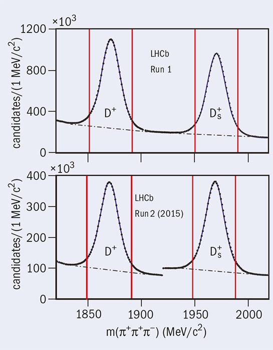 The LHCb team used a sample of about 25 million each of D+ and D+s meson decays to π+π+π– collected during Run 1 and the first year of Run 2 of the LHC (figure 1). The analysis used a boosted decision tree to suppress backgrounds, with fits to the π+π– mass spectra from the D+ and D+s decays used to set limits on the amount of η and η′ that could be present. No evidence for the CP-violating decays was found and upper limits were set on the branching fractions, at 90% confidence level, of less than 1.6 × 10–5 for η → π+π– and 1.8 × 10–5 for η′(958) → π+π–. The result for the η meson is comparable with the current world best, while that for the η′ is a factor three below the previous best, further constraining the possibility for a new CP-violating mechanism in strong interactions.