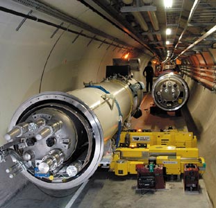 Installation tests in the LHC tunnel in January 2004: a short, straight section is positioned next to a superconducting dipole.